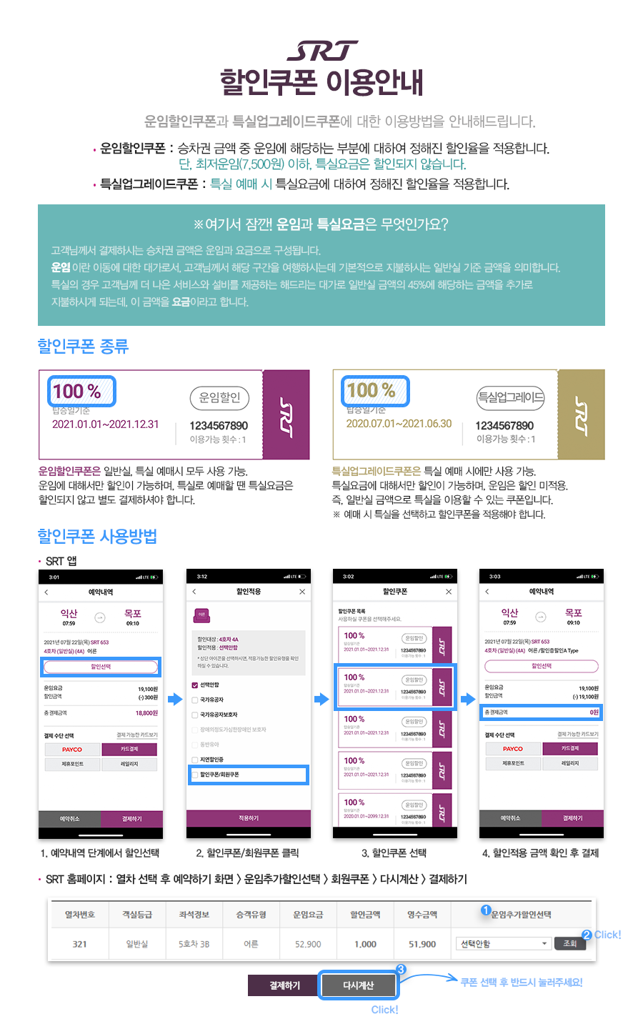 - 쿠폰 다운로드 : SRT 공식 홈페이지나 제휴된 사이트에서 할인 쿠폰을 다운로드합니다.